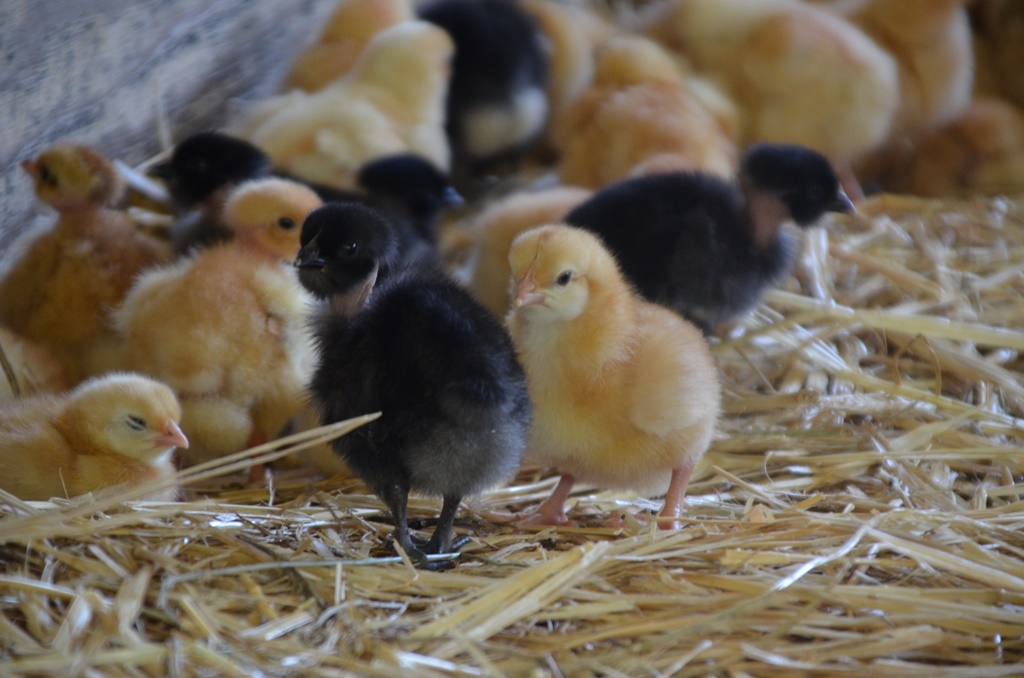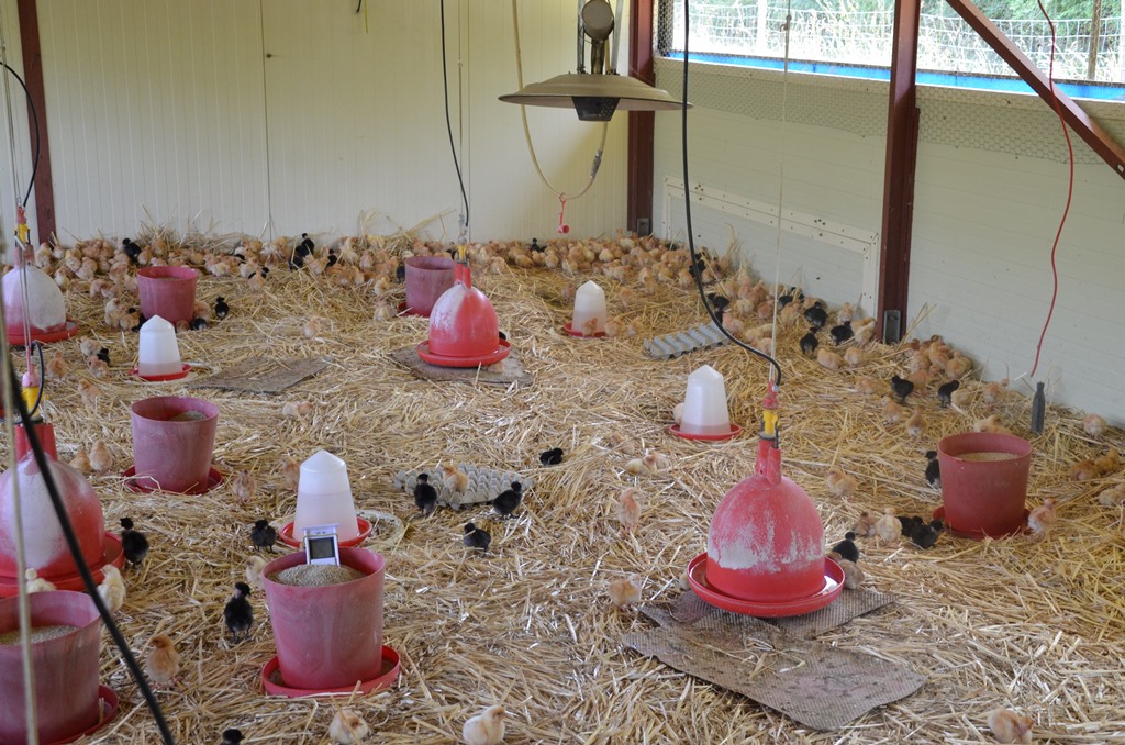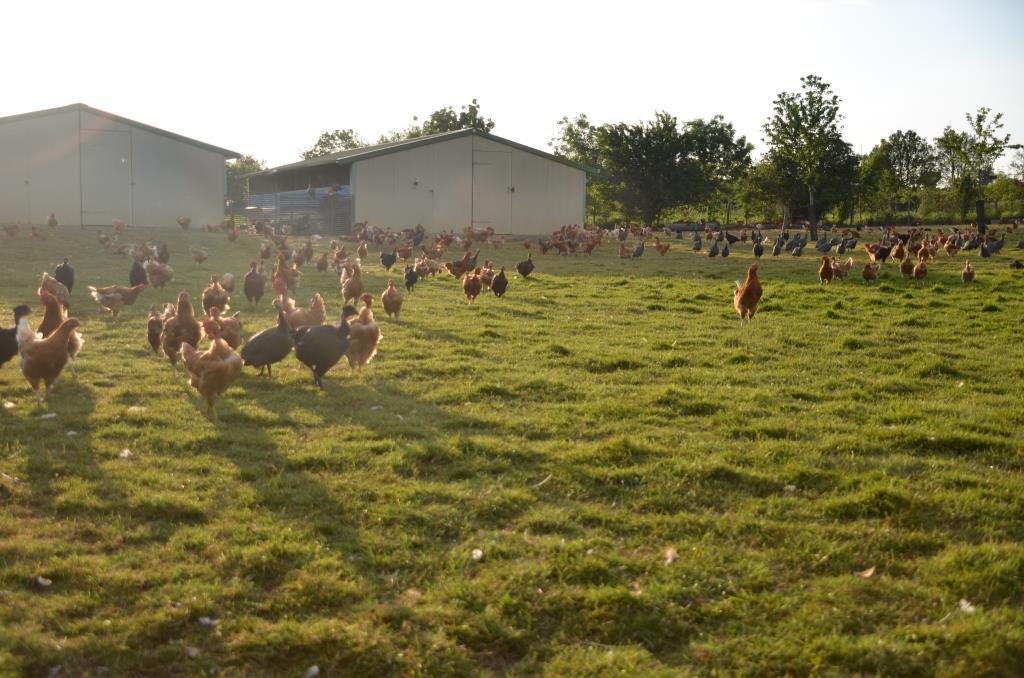 Nous élevons 3 lots de 1200 poulets et 300 pintades par an. Les poussins arrivent à l’âge d’un jour, et sont élevés en plein air pendant 90 à 120 jours.