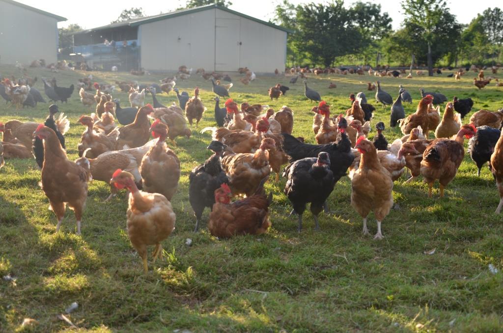 Poulets et pintades, élevés en plein air, labellisés en agriculture biologique, dans des bâtiments déplaçables.